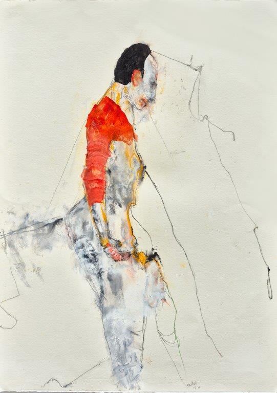 Technique mixte sur papier par Benoit Genest Rouillier à vendre en galerie d'art à Montréal. « Les années passent comme un fil orange » disponible à la Galerie Blanche.