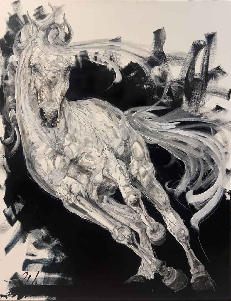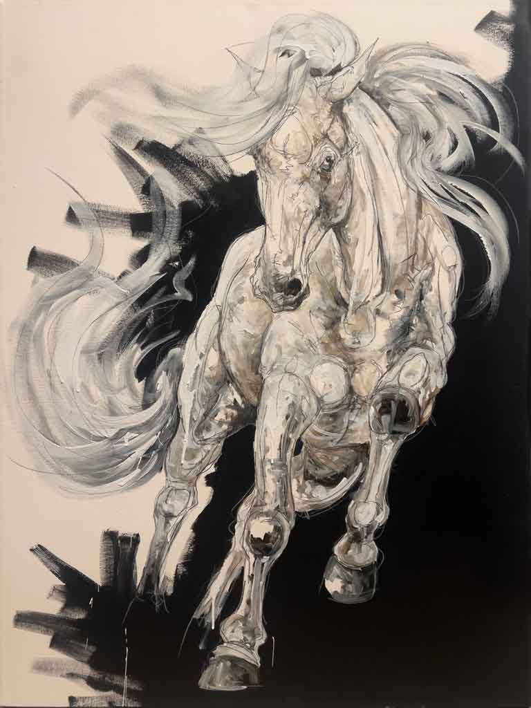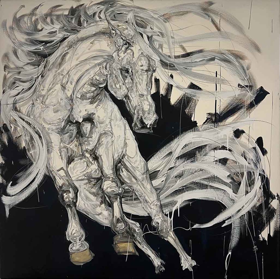 Sébastien Larochelle, a painter originally from Abitibi-Témiscamingue, has lived and worked in L’Assomption for about ten years. A graduate with a bachelor’s degree in fine arts, he has developed a contemporary painting practice focused on the expressiveness of gesture, the power of movement, and the vitality of life. Working primarily with acrylics, often combined with other media, Larochelle is particularly known for his equestrian works, whose energy and sensitivity have defined his artistic identity. His visual world also includes depictions of bulls, roosters, and koi, subjects in which he explores tension, vitality, and the animal’s presence.