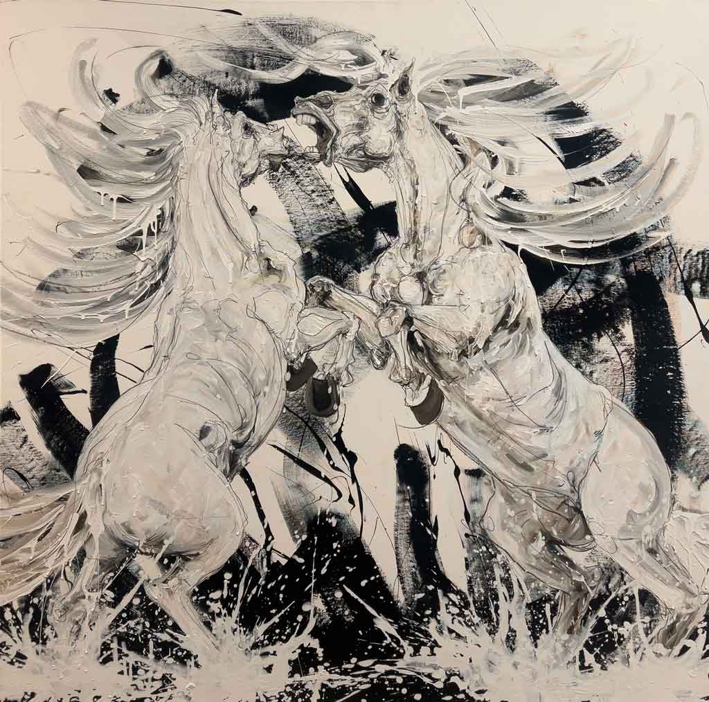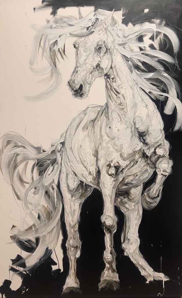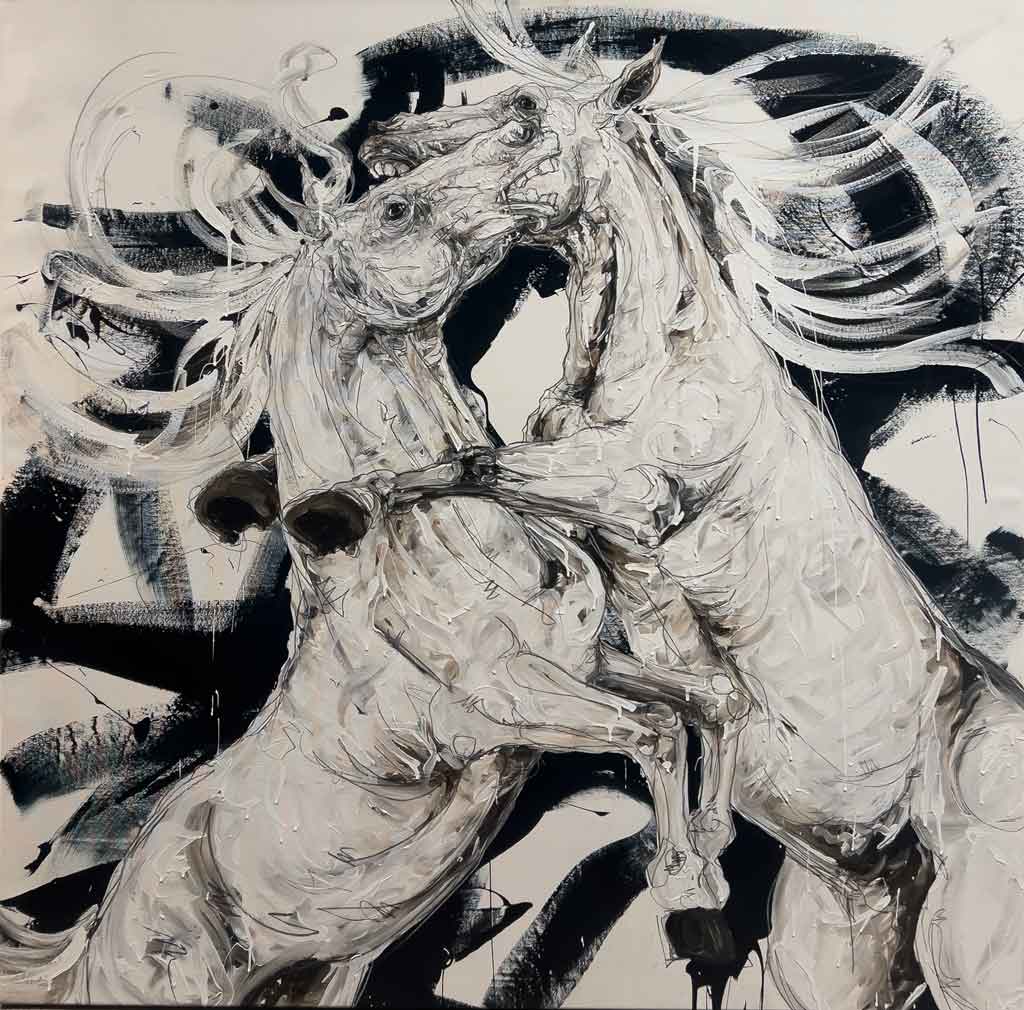 Par une gestualité affirmée et une peinture vibrante, Sébastien Larochelle propose une vision où la force brute et l’élan vital deviennent langage, célébrant la relation profonde entre l’humain et l’animal.